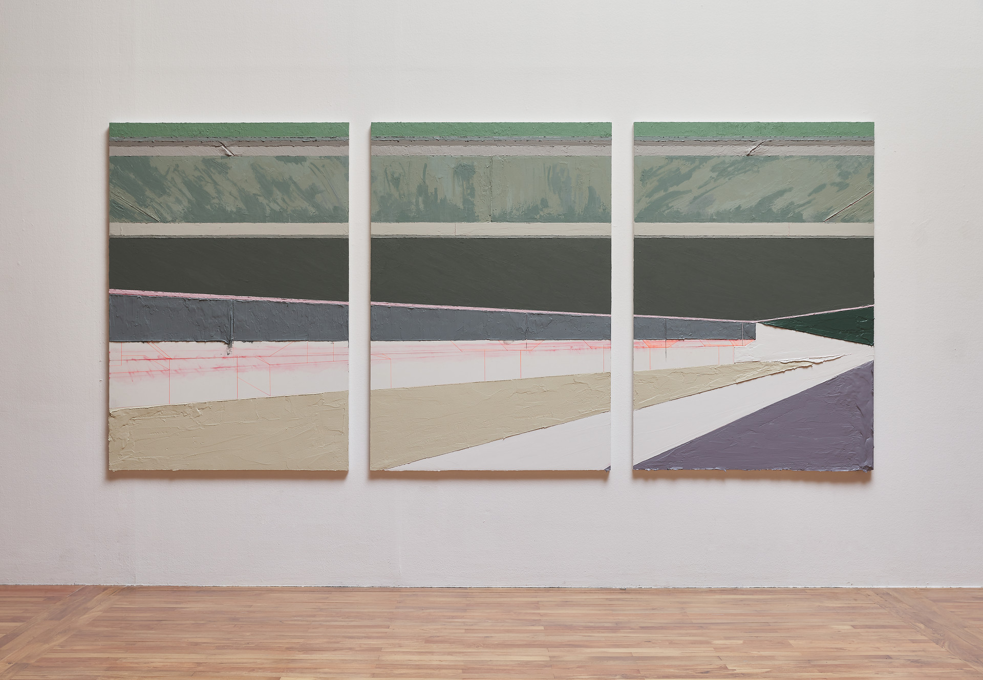 <교량 슬래브 교각부>, 2021, 캔버스에 아크릴, 모델링 페이스트, 겔 미디엄, 모래, 마커, 먹줄, 162.2×336.3cm (3p)